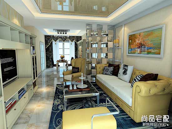 简约风格装修效果图客厅第一款:以淡黄色的欧式沙发为主,沙发很大气,配上一个大屏幕电视,而电视下面的电视柜是黑白相间,显得非常素雅。在主沙发的两边,有简易四方茶几,两盏欧式台灯,灯光是暖黄色的,然后在电视柜的旁边,也放了一个一米多高的展示台,上面摆了一个欧州艺术品。装修出来的风格让人心情非常安逸而平静。