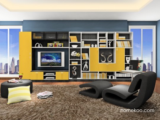 这款是用黑白的电视柜搭配着黄色烤漆,有着强烈色彩对比。家里墙体比较宽时只是摆放电视柜会比较空荡,结合多功能的电视柜很好利用墙体的空间。此款柜体的收纳,密闭与开放功能同时并存。
