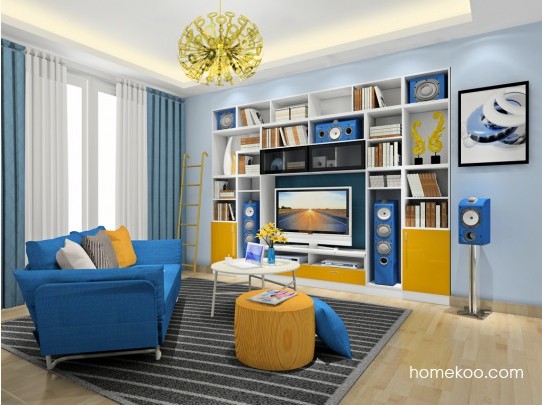 客厅的墙面采用了淡雅的蓝,仿若时时都能看见清晨晴朗的天空,而黄色的点缀则使人们在黑夜里,也仿若沐浴在阳光下,温暖而舒适. 经典电视柜组合,中间放置电视的同时两边开放式高柜可放置音响在柜体里面更好的利用,运用高低柜体满足收纳的不同需求。