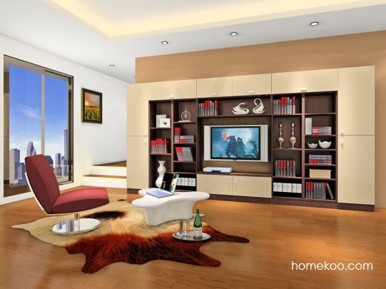 在中间的电视位是以矮柜拼搭着可以放置DVD或者机顶盒等,同时两边以开放式柜体组合成大小不同的收纳位,摆放高矮不同的书籍和饰品。最外围是封闭式柜体可以收纳不常用的物品,整个电视柜不仅实用方便,而且时尚大方。