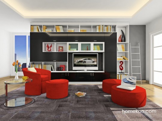 黑白配色的设计都适合时尚经典的搭配,加上红色饰品来点缀突显整体的效果。背景是以灰色为主来搭配黑白柜体以黑白灰配色。在电视上是带有玻璃的格子柜,放置小物件来装饰,封闭式柜体是以黑色面板来围绕形成一个G字型的柜体,在外围是开放式柜体来搭配,组成一款很时尚的电视柜。