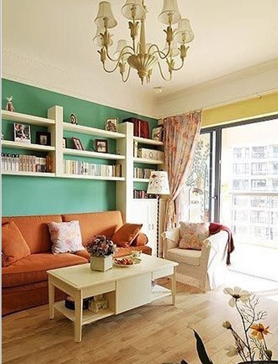 绿色、橙色、黄色、明亮的颜色搭配在一起,用白色来调剂所有的颜色,小清新风格的客厅就呈现出来了,布艺沙发与碎花窗帘的修饰,感受那田园风格。