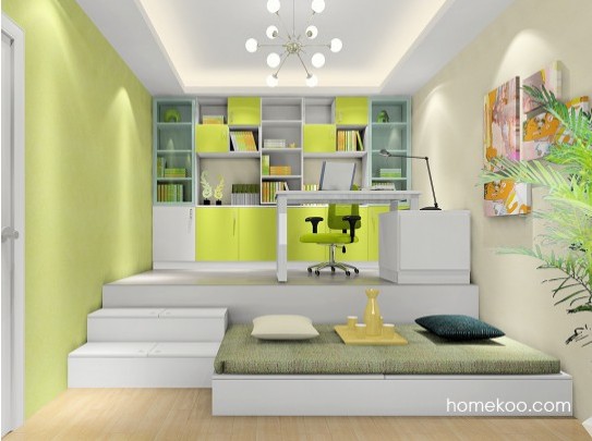 现代简约小户型高低床榻榻米式卧室装修效果图2014图片,高低的榻榻米式床,房间很小,所以从墙的一头顶到了另一端,鹅黄色的飘窗窗帘装修效果图,小卧室还兼顾了书房的作用,这样的高低床榻榻米式靓丽卧室装扮一定会让你很喜欢。